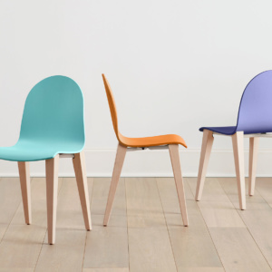 The design of the chair blends the strength of a steel supported wood frame with the contours of a compound curved plywood shell. Quince chairs are offered in two shell shapes and over 40 standard cutout and engraving options. Custom graphic capabilities are nearly endless. The complimentary Quince table is offered in a variety of heights and sizes with either a veneer or HPL surface. Table legs can be matched or contrasted with the seating.